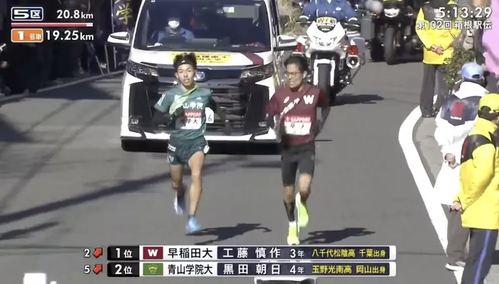队中王牌黑田朝日在五区坡路上,一路赶超四所高校,带领队伍从落后3分钟到夺得往路优胜,展现了一次史诗级追击。
